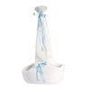 In French: Poupée New Born de 42cm, yeux bleus et corps souple. Tête, bras et jambes en matière vinyle. Il porte un pyjama blanc avec un fin motif de cigogne, une longue capuche et des chaussettes bleues. Comprend un berceau suspendu, une sucette et un porte-sucette Bébé avec berceau suspendu bleu 42cm SV nan