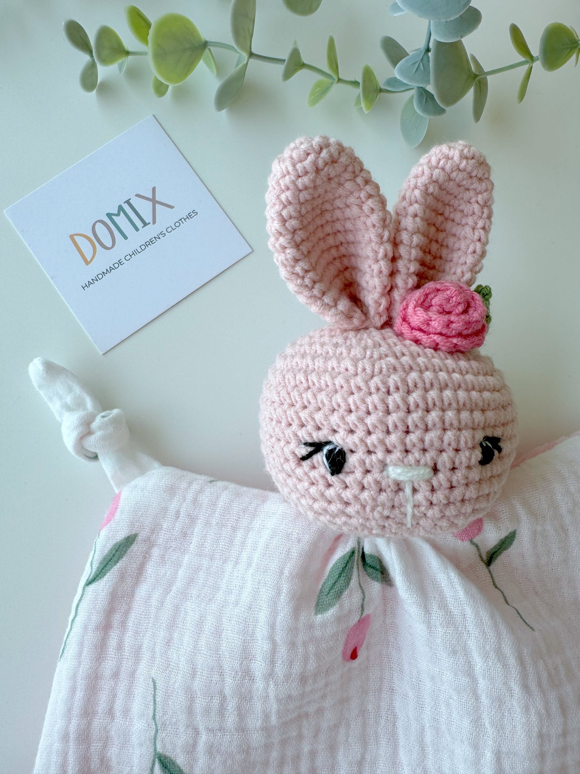 Meet your little one’s new favorite cuddle companion! This handmade bunny comfort toy features soft cotton yarn and an attached mini blanket—perfect for snuggles, soothing, and sensory comfort. A convenient pacifier attachment loop keeps baby’s soother always close at hand.