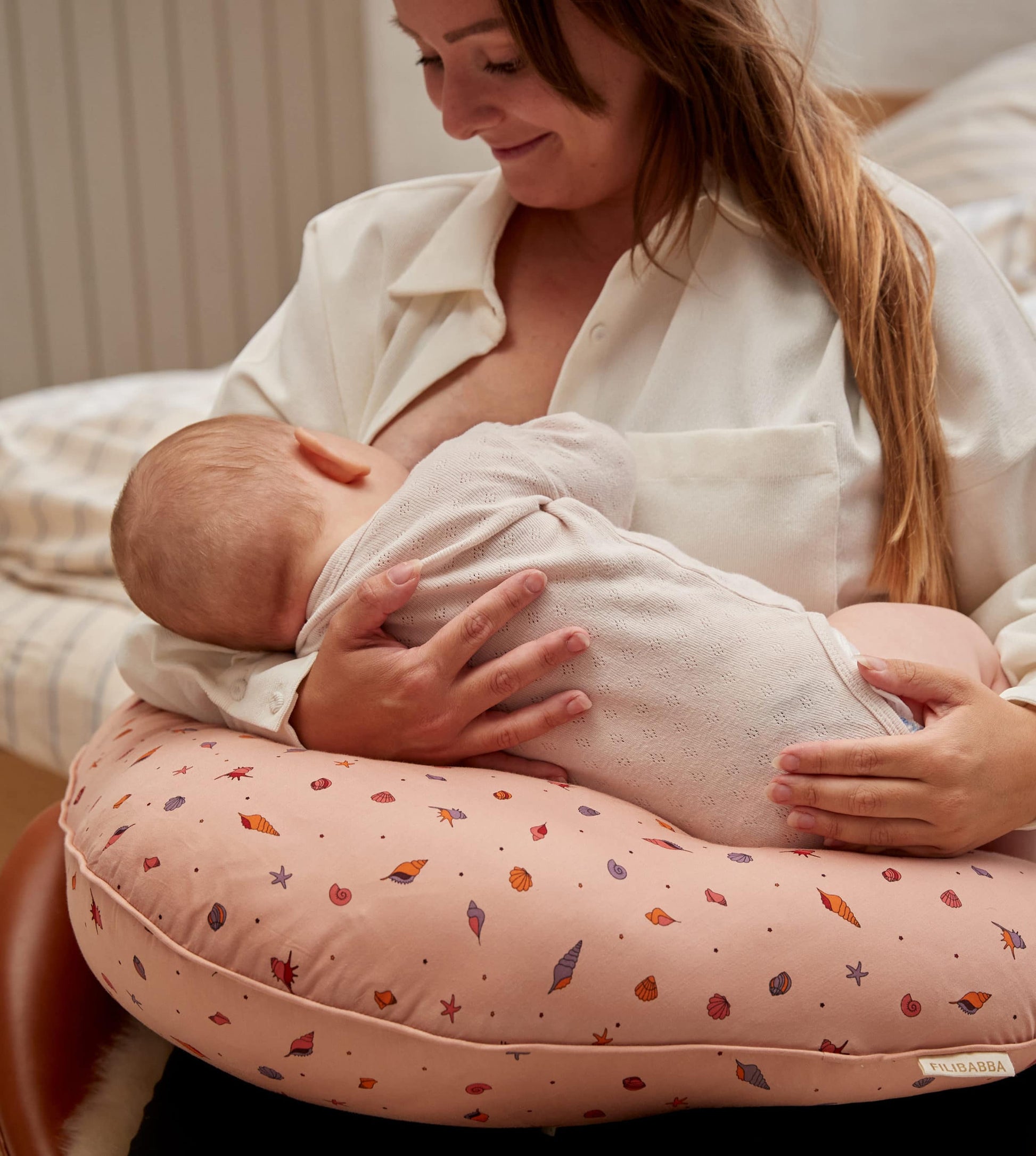 Het FILIBABBA Borstvoedingskussen uit de 'Collectie van Herinneringen' brengt een gevoel van kalmte en vrijheid. 🌊 Geïnspireerd door de moeiteloze schoonheid van het zoeken naar schelpen op het strand, roept het handgetekende ontwerp dromen en herinneringen op die je koestert.